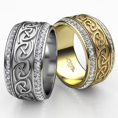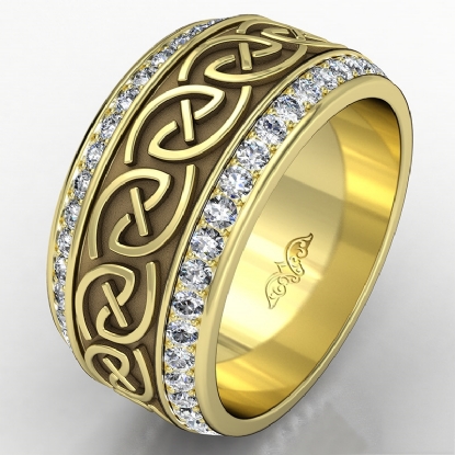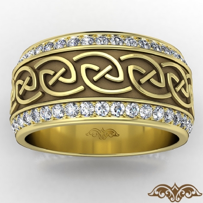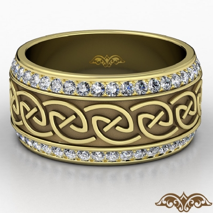 Handmade celtic style men's diamond eternity wedding band crafted in 14k Gold Yellow. This stylish wedding ring showcasing the beautiful celtic style design in center and 1 carat round diamonds on edges in a micro pave setting. We can make this ring in all available metals like 14k & 18k white gold, yellow gold, rose gold, and platinum 950. (1Ct. tw.)