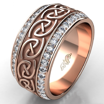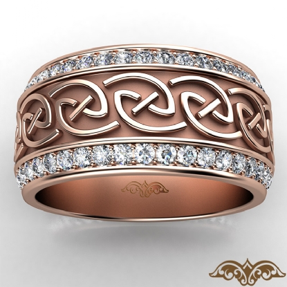 Handmade celtic style men's diamond eternity wedding band crafted in 14k Rose Gold. This stylish wedding ring showcasing the beautiful celtic style design in center and 1 carat round diamonds on edges in a micro pave setting. We can make this ring in all available metals like 14k & 18k white gold, yellow gold, rose gold, and platinum 950. (1Ct. tw.)