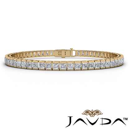 A pretty princess diamond bracelet features total diamonds set in a channel eternity line. Enhance the look of any outfit with this eternity line diamond bracelet. The length of bracelet is 7.25 inches and 3.2mm width, made from 18k Gold Yellow. Available in 18k white gold and yellow gold. (9Ct. tw.)
