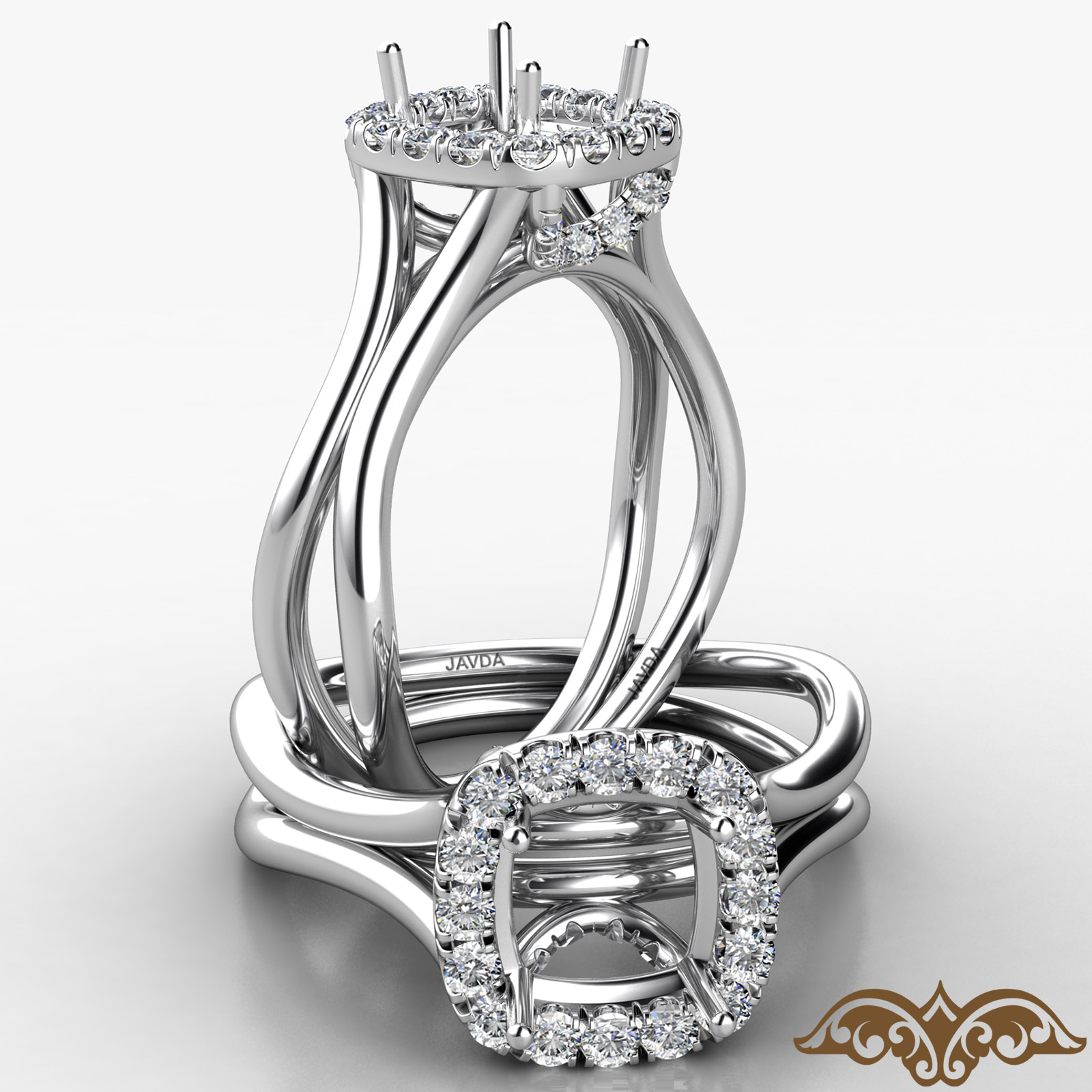 Gorgeous halo diamond engagement ring crafted in 14k Gold White. This intricate designer ring features a split shank and cushion cut semi mount surrounded by a dazzling diamonds beautifully set in a french U split pave and diamonds on bridge accent complete this ring. Available in white gold, yellow gold, rose gold and platinum. (0.4Ct. tw.)