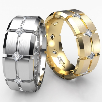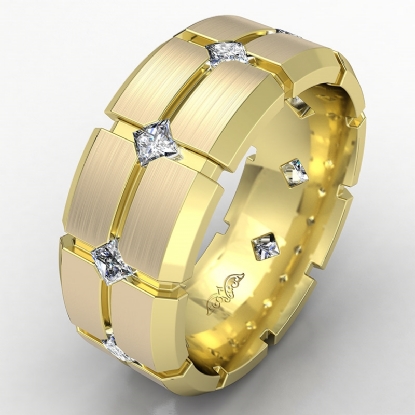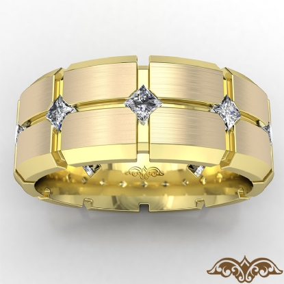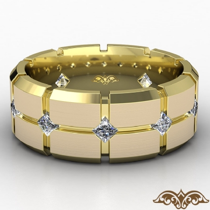 A modern design men's eternity princess diamond wedding band handcrafted in precious metal 18k Gold Yellow. This unique style wedding ring features princess diamonds in a bezel setting beautifully set on polished grooved and matte surface with beveled edges. This comfort fit band available in 14k and 18k white gold, yellow gold, rose gold and platinum 950. (1Ct. tw.)