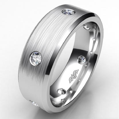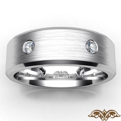Classic men's eternity bezel round diamond wedding band made in 18k Gold White. This wedding ring features round diamonds in a bezel setting on matte surface with polished beveled edges. This simple comfort fit band available in 14k and 18k white gold, yellow gold, rose gold and platinum 950. (0.4Ct. tw.)