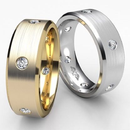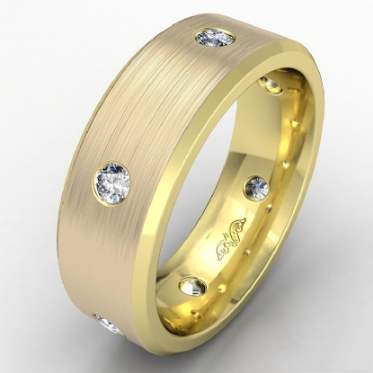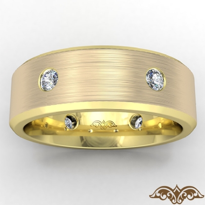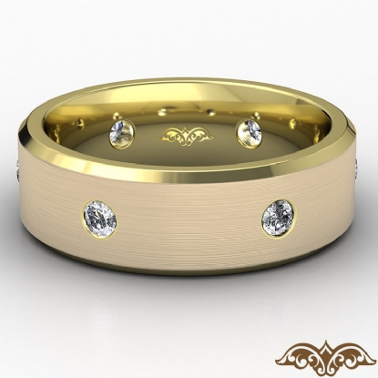 Classic men's eternity bezel round diamond wedding band made in 18k Gold Yellow. This wedding ring features round diamonds in a bezel setting on matte surface with polished beveled edges. This simple comfort fit band available in 14k and 18k white gold, yellow gold, rose gold and platinum 950. (0.4Ct. tw.)