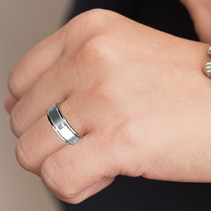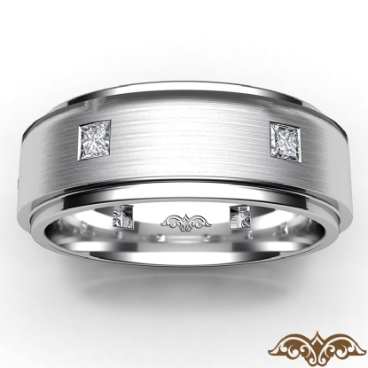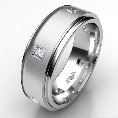 A timeless designer matte finish men's eternity bezel princess diamond wedding band crafted in 18k Gold White. Showcasing polished finish step edge with princess diamonds in a bezel setting on matte surface. This comfort fit wedding band is available in 14k and 18k white gold, yellow gold, rose gold and platinum 950. (0.5Ct. tw.)