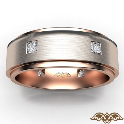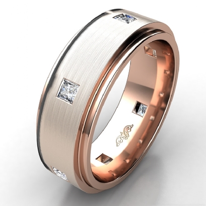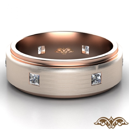 A timeless designer matte finish men's eternity bezel princess diamond wedding band crafted in 18k Rose Gold. Showcasing polished finish step edge with princess diamonds in a bezel setting on matte surface. This comfort fit wedding band is available in 14k and 18k white gold, yellow gold, rose gold and platinum 950. (0.5Ct. tw.)