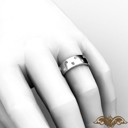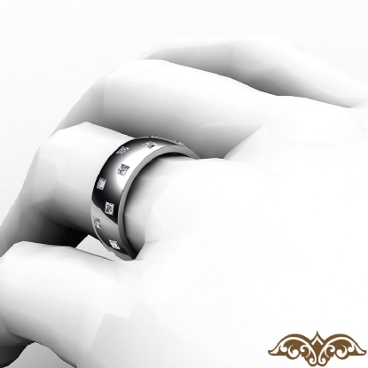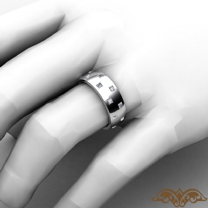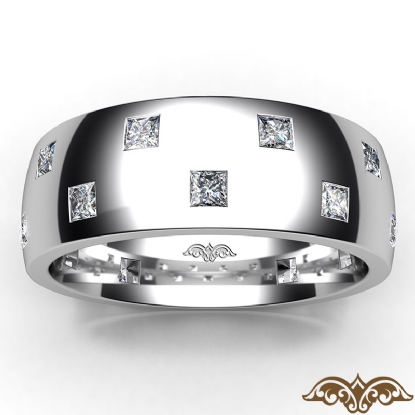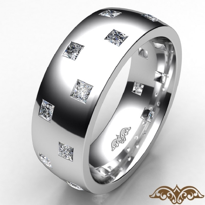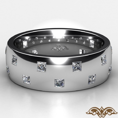 Amazing checker pattern men's eternity bezel princess diamond wedding band handcrafted in 18k Gold White. This polished finish wedding band features princess diamonds in a bezel setting on checkered board pattern. This comfort fit wedding band for him is available in 14k and 18k white gold, yellow gold, rose gold and platinum 950. (1.2Ct. tw.)