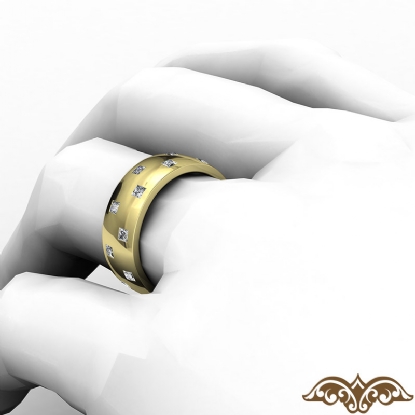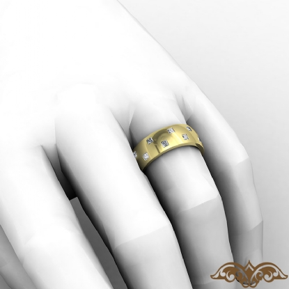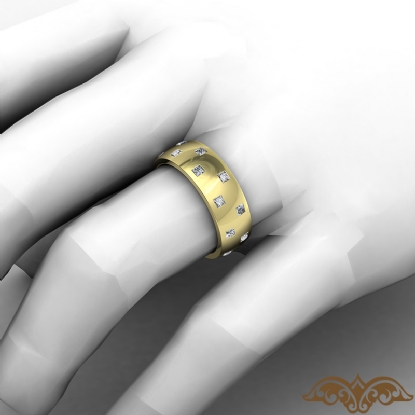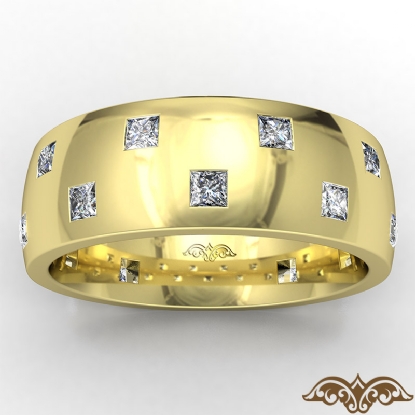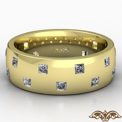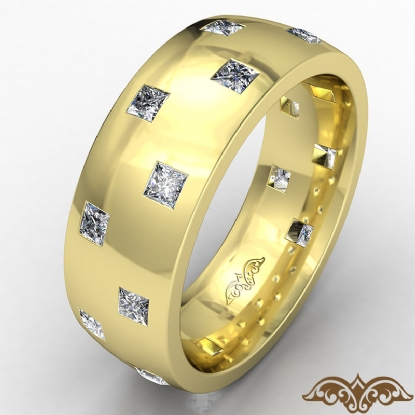 Amazing checker pattern men's eternity bezel princess diamond wedding band handcrafted in 18k Gold Yellow. This polished finish wedding band features princess diamonds in a bezel setting on checkered board pattern. This comfort fit wedding band for him is available in 14k and 18k white gold, yellow gold, rose gold and platinum 950. (1.2Ct. tw.)