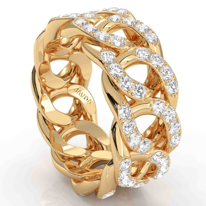 Intricate cuban link chain design men's eternity diamond wedding band crafted in precious metal 14k Gold Yellow. This wedding ring features cuban link chain design with round diamonds artfully set in a micro pave setting. This band for men is available in 14k and 18k white gold, yellow gold, rose gold and platinum 950. (1.6Ct. tw.)