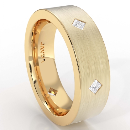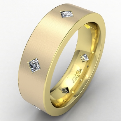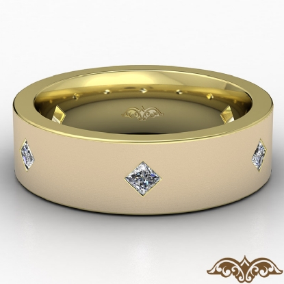 Simple and unique bezel diamond men's eternity wedding band made in 18k Gold Yellow. This wedding ring for men features princess diamonds set on matte finish surface in a bezel setting with kite style. This classic wedding ring is available in 14k & 18k white gold, yellow gold, rose gold, and platinum 950. (0.55Ct. tw.)