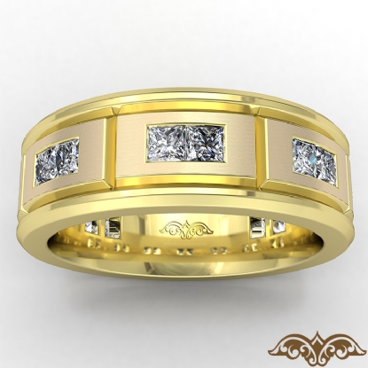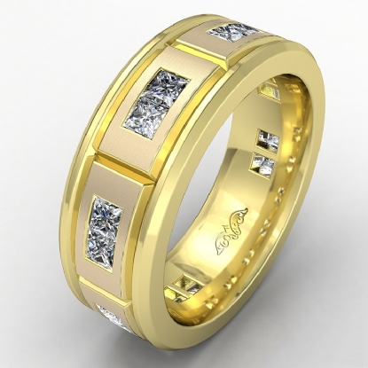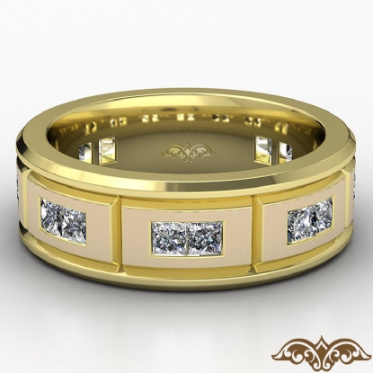 This eye catching modern men's diamond eternity wedding band handmade in 18k Gold Yellow. Features a beautiful polished grooved design and princess diamonds on matte finish surface in a channel setting. This is a magnificent way to seal one's commitment, available in 14k & 18k white gold, yellow gold, rose gold, and platinum 950. (1.44Ct. tw.)