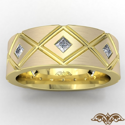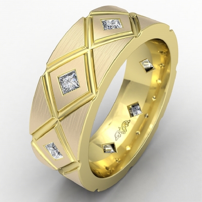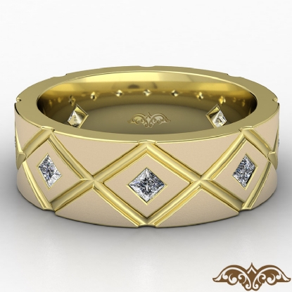 Designer diamond cut men's eternity princess diamond wedding band crafted in 18k Gold Yellow. This master piece features princess diamonds in a bezel setting on matte finish and beautiful diamond cut grooved in a polished finish. This band for men is available in 14k and 18k white gold, yellow gold, rose gold and platinum 950. (0.6Ct. tw.)