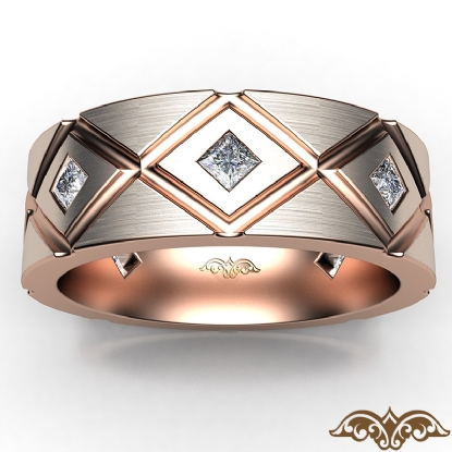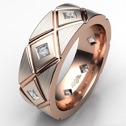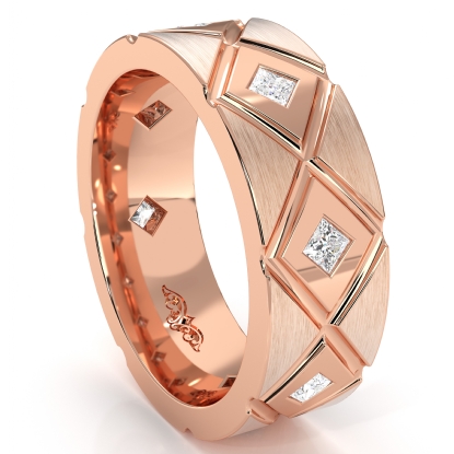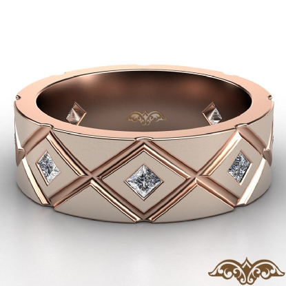 Designer diamond cut men's eternity princess diamond wedding band crafted in 14k Rose Gold. This master piece features princess diamonds in a bezel setting on matte finish and beautiful diamond cut grooved in a polished finish. This band for men is available in 14k and 18k white gold, yellow gold, rose gold and platinum 950. (0.6Ct. tw.)
