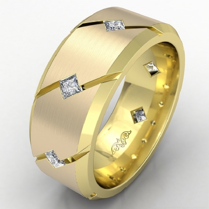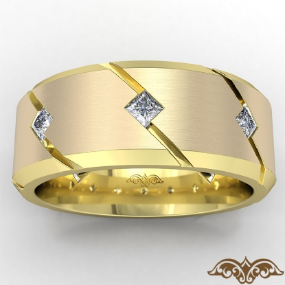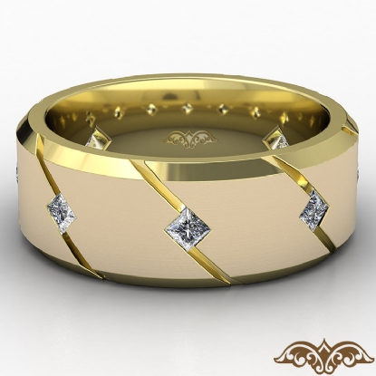 This stylish men's eternity princess diamond wedding band made in 14k Gold Yellow. Features princess diamonds in a bezel setting on polished finish diagonal grooves. This matte finish band for men is available in 14k and 18k white gold, yellow gold, rose gold and platinum 950. (0.75Ct. tw.)