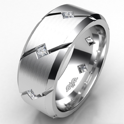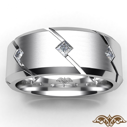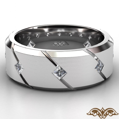 This stylish men's eternity princess diamond wedding band made in 18k Gold White. Features princess diamonds in a bezel setting on polished finish diagonal grooves. This matte finish band for men is available in 14k and 18k white gold, yellow gold, rose gold and platinum 950. (0.6Ct. tw.)