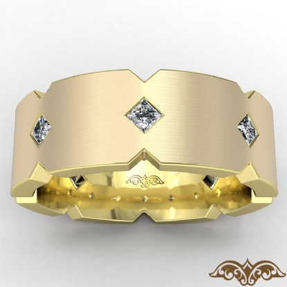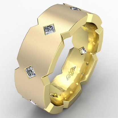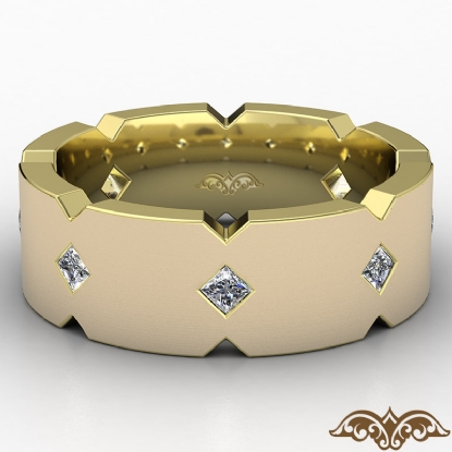 A classic jagged edge men's eternity bezel princess diamond wedding band handmade in 14k Gold Yellow. This wedding ring features princess diamonds in a bezel setting on matte surface with jagged edges. This simple comfort fit band available in 14k and 18k white gold, yellow gold, rose gold and platinum 950. (0.5Ct. tw.)