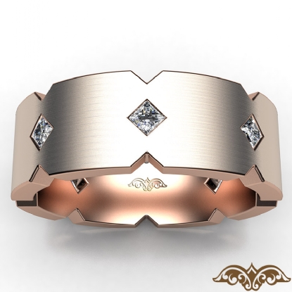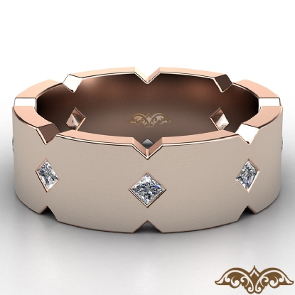 A classic jagged edge men's eternity bezel princess diamond wedding band handmade in 18k Rose Gold. This wedding ring features princess diamonds in a bezel setting on matte surface with jagged edges. This simple comfort fit band available in 14k and 18k white gold, yellow gold, rose gold and platinum 950. (0.5Ct. tw.)