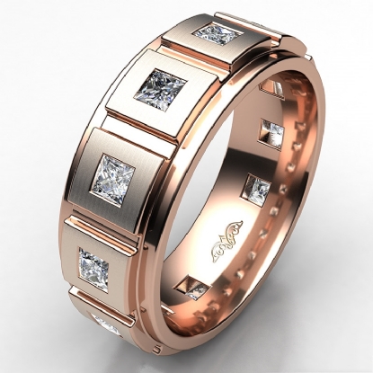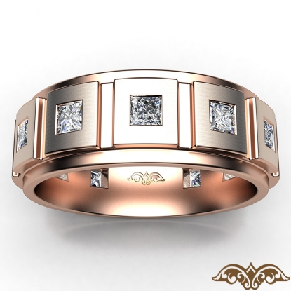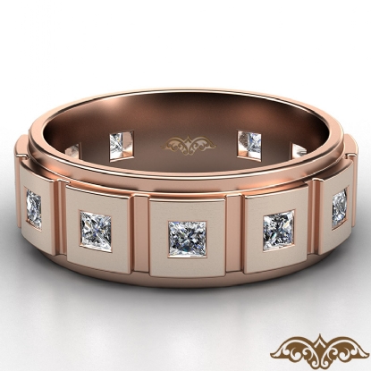 Classic and durable step edge matte finish eternity princess diamond men's wedding band handcrafted in 14k Rose Gold. This handsome wedding ring features princess diamonds in a bezel setting on matte finish surface and polished finish step edge. This comfort fit band available in 14k and 18k white gold, yellow gold, rose gold and platinum 950. (1.4Ct. tw.)