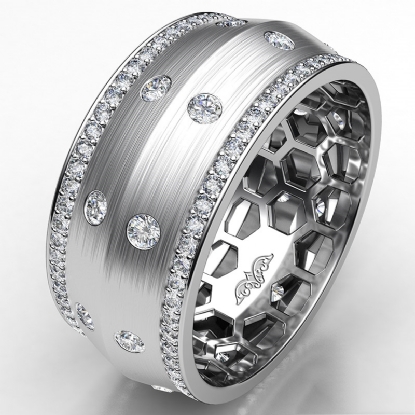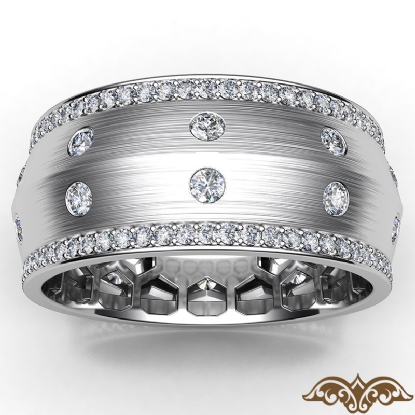 A sophisticated bezel set knife edge diamond eternity men's wedding band handcrafted in 18k Gold White. This charming comfort fit wedding band features round diamonds in a micro pave setting on edges and bezel set on matte finish center. This wedding ring gives a perfect look to his style, available in 14k & 18k white gold, yellow gold, rose gold and platinum 950. (1.31Ct. tw.)