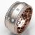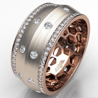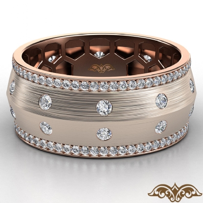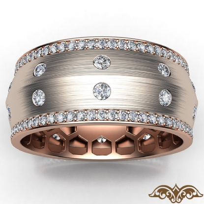A sophisticated bezel set knife edge diamond eternity men's wedding band handcrafted in 18k Rose Gold. This charming comfort fit wedding band features round diamonds in a micro pave setting on edges and bezel set on matte finish center. This wedding ring gives a perfect look to his style, available in 14k & 18k white gold, yellow gold, rose gold and platinum 950. (1.31Ct. tw.)