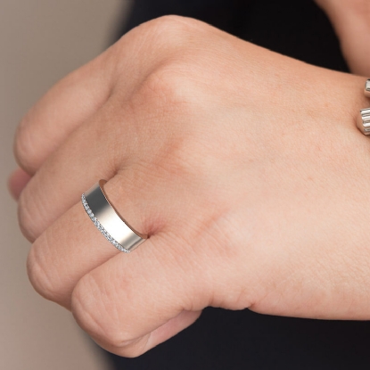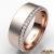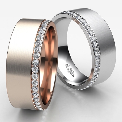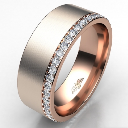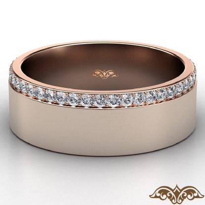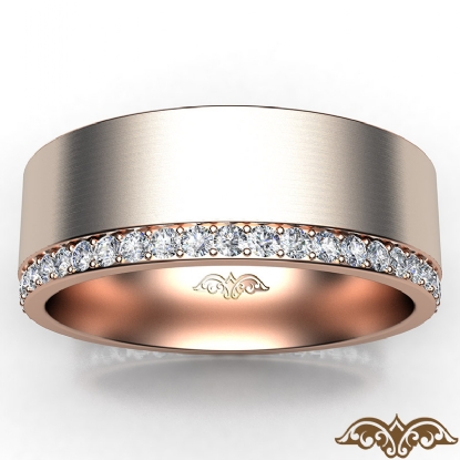 A classic offset matte finish diamond eternity men's wedding band made in 18k Rose Gold. This comfort fit wedding band features matte finish surface with carat round diamonds in a micro pave setting on edge offset of the ring. Available in 14k & 18k white gold, yellow gold, rose gold and platinum 950. (0.8Ct. tw.)