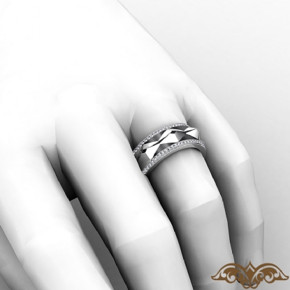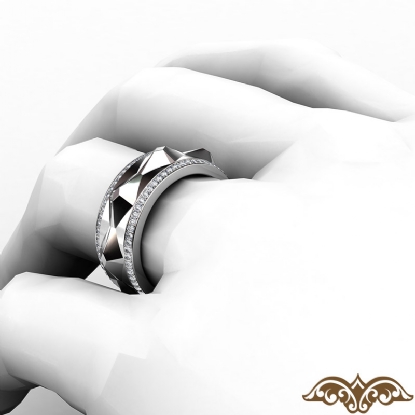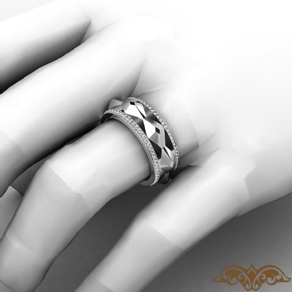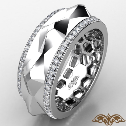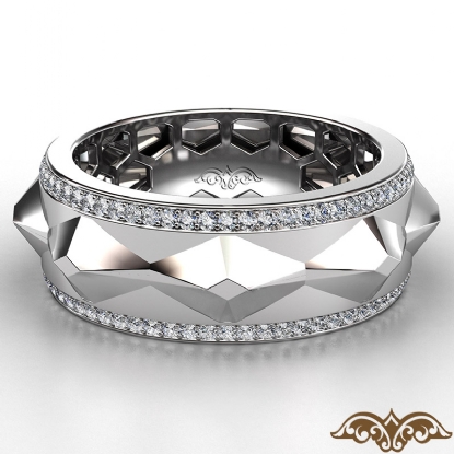 Unique and vintage style facet cut diamond eternity men's wedding band handmade in 18k Gold White. This comfort fit wedding band features a polished finish facet cuts in a centre with round diamonds in a micro pave setting on edge. Available in 14k & 18k white gold, yellow gold, rose gold and platinum 950. (1Ct. tw.)