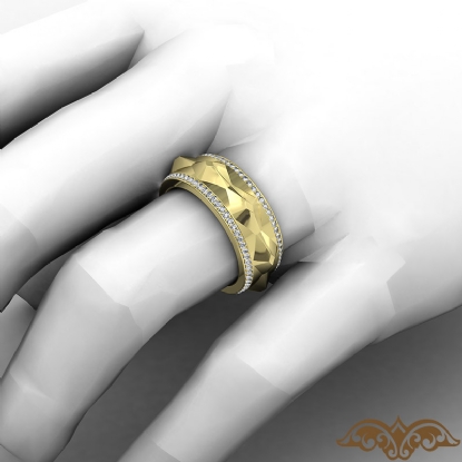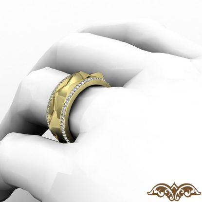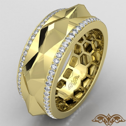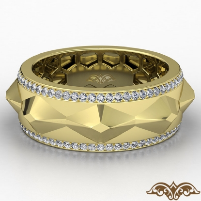 Unique and vintage style facet cut diamond eternity men's wedding band handmade in 18k Gold Yellow. This comfort fit wedding band features a polished finish facet cuts in a centre with round diamonds in a micro pave setting on edge. Available in 14k & 18k white gold, yellow gold, rose gold and platinum 950. (1Ct. tw.)