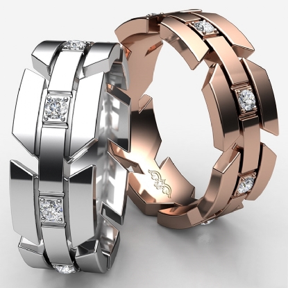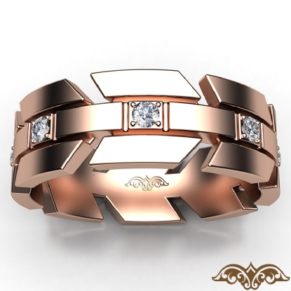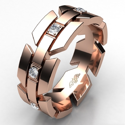 Classic and durable infinity arrow diamond eternity men's wedding band made in 14k Rose Gold. Features round diamonds in a micro pave setting with horizontal grooved in a polished finished metal. This comfort fit ring for men is available in 14k & 18k white gold, yellow gold, rose gold and platinum 950. (0.4Ct. tw.)