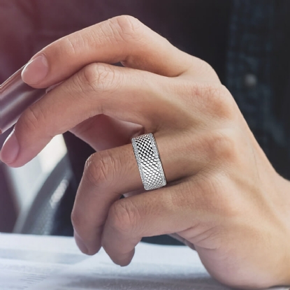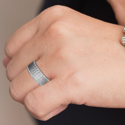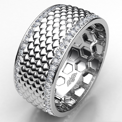 A beautiful fish scale patterned diamond eternity men's wedding band handmade in 18k Gold White. This luxurious wedding ring features round diamonds in a micro pave setting on edges with unique centre pattern in a polished finished metal. Available in 14k & 18k white gold, yellow gold, rose gold and platinum 950. (1Ct. tw.)