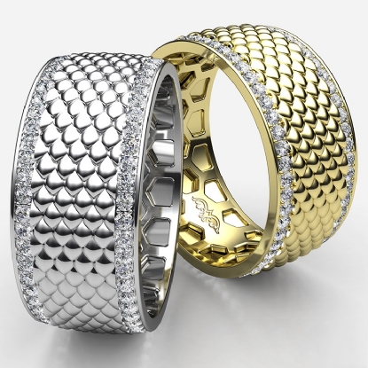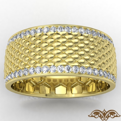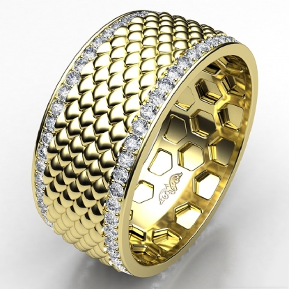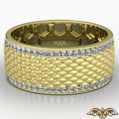 A beautiful fish scale patterned diamond eternity men's wedding band handmade in 18k Gold Yellow. This luxurious wedding ring features round diamonds in a micro pave setting on edges with unique centre pattern in a polished finished metal. Available in 14k & 18k white gold, yellow gold, rose gold and platinum 950. (1Ct. tw.)