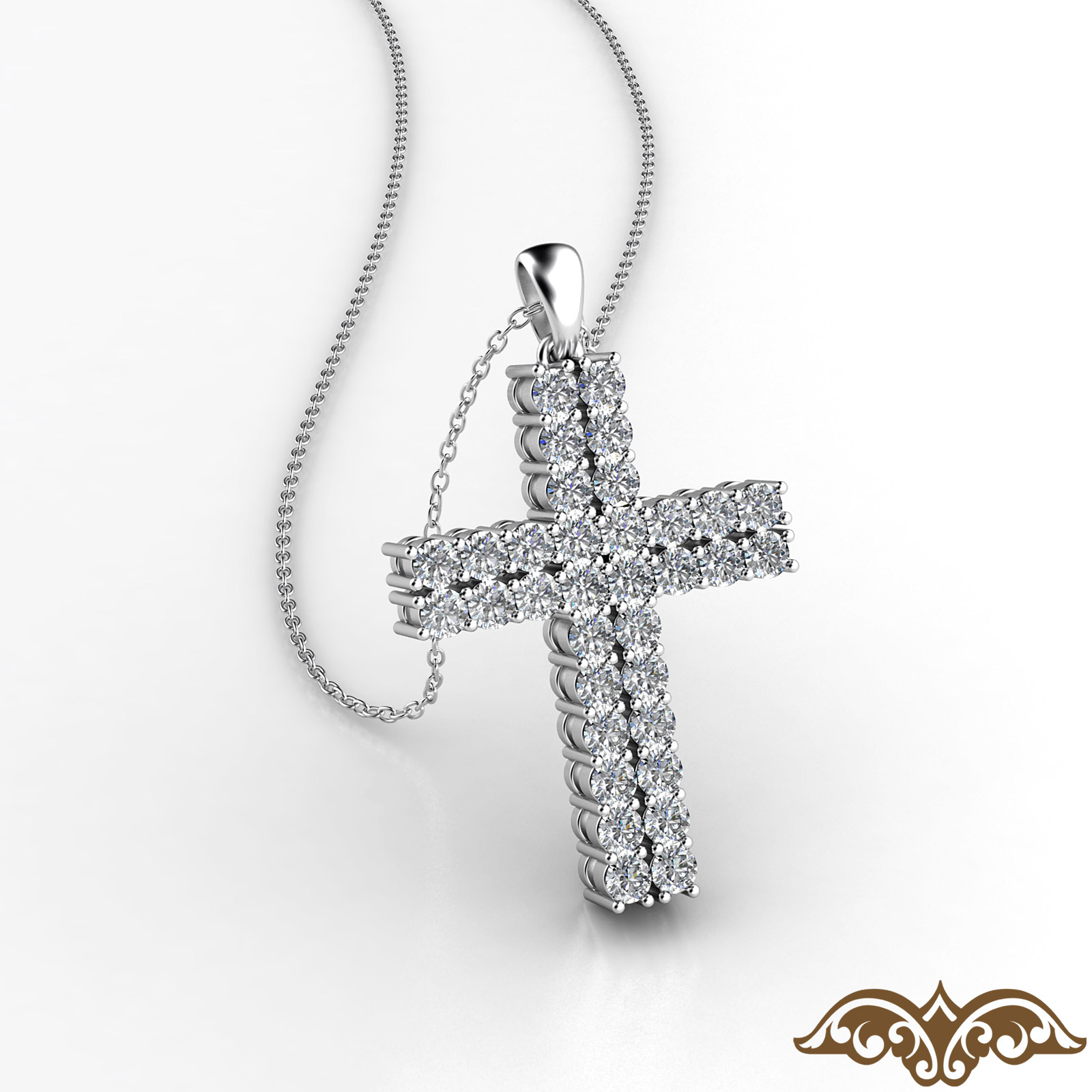 Luxurious two row round diamond cross pendant necklace handmade in 18k Gold White. This fashionable faith pendant features round diamonds in a prong setting with 18 inch rolo chain that secures with a lobster clasp. Available in 14k & 18k white gold, yellow gold, rose gold and platinum 950. If you don't find your desired jewelry, please don't hesitate to contact our designer to make your custom jewelry design (0.45Ct. tw.)