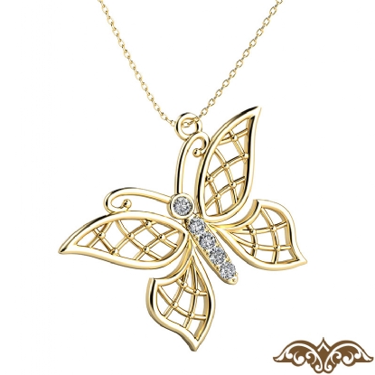 Delicate and beautiful women's butterfly charm diamond pendant necklace made in high quality 18k Gold Yellow. This butterfly pendant features 5 round diamonds in a pave setting with polished finish filigree wings. This gorgeous piece is perfect to gift your loved one, available in 14k & 18k white gold, yellow gold, rose gold and platinum 950. If you don't find your desired jewelry, please don't hesitate to contact our designer to make your custom jewelry design (0.04Ct. tw.)