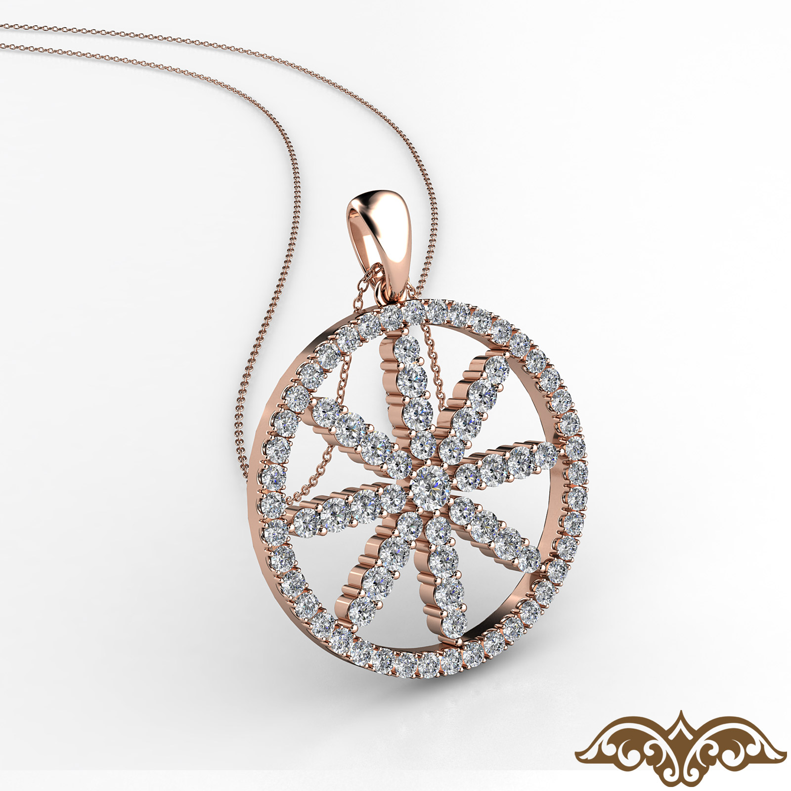 Stunning circle flower women's diamond pendant necklace handmade in high quality 18k Rose Gold. This beautiful pendant features round diamonds in a U cut pave setting and