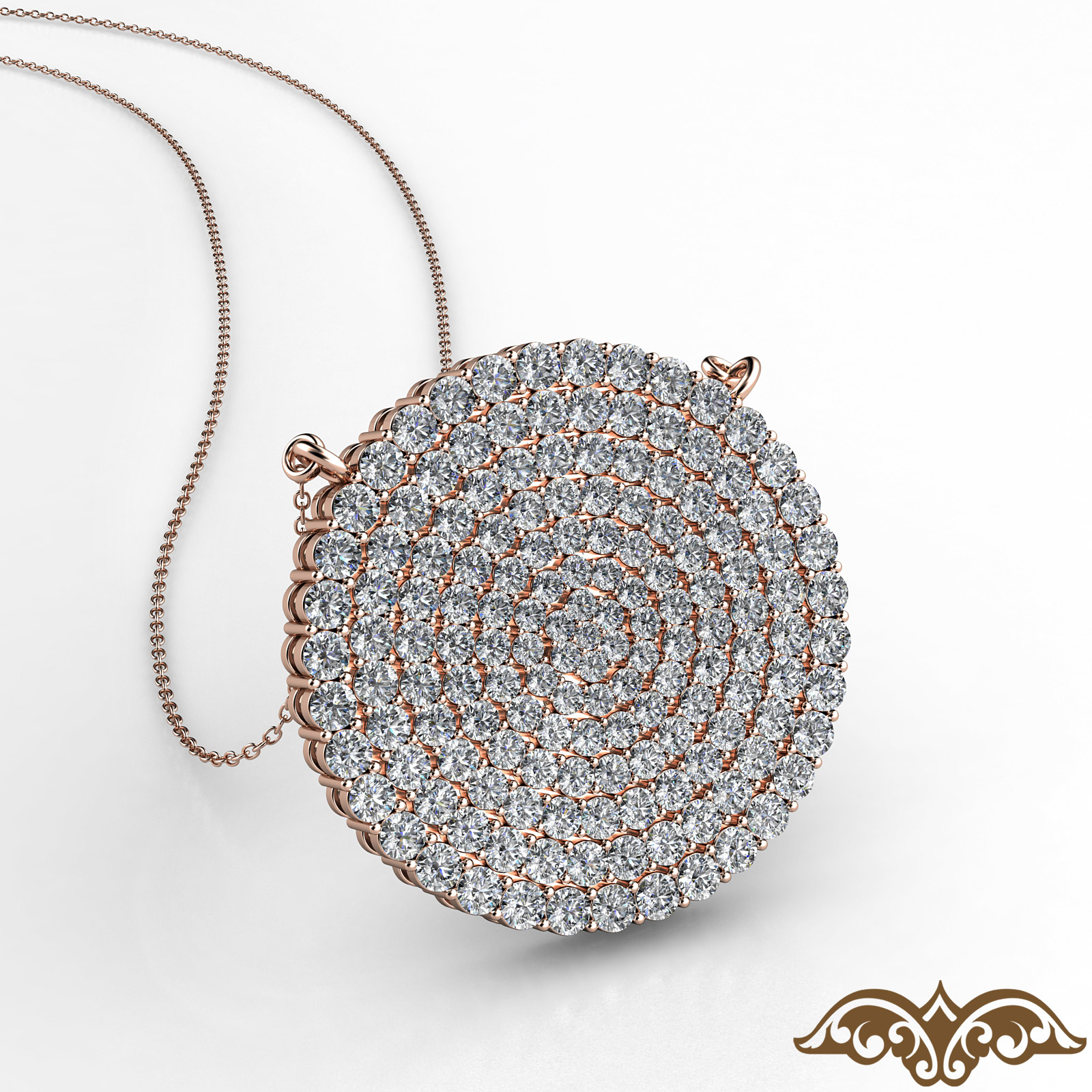Modern design circle cluster diamond women's pendant necklace made in 18k Rose Gold. This elegant pendant features round diamonds in a prong setting with 18 inch rolo chain that secures with polished clasp. Available in 14k & 18k white gold, yellow gold, rose gold and platinum 950. If you don't find your desired jewelry, please don't hesitate to contact our designer to make your custom jewelry design. (2.35Ct. tw.)