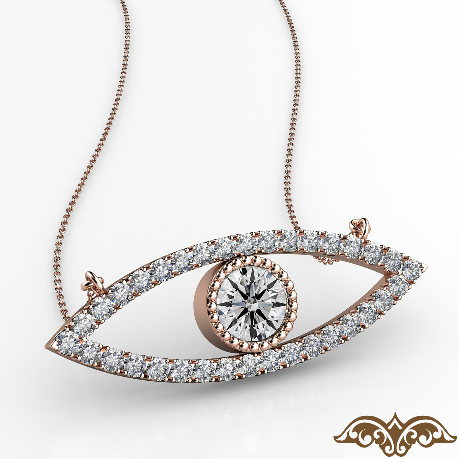 This good luck charm evil eye women's diamond pendant necklace handmade in 18k Rose Gold. Features milgrain detailing bezel set round diamond and