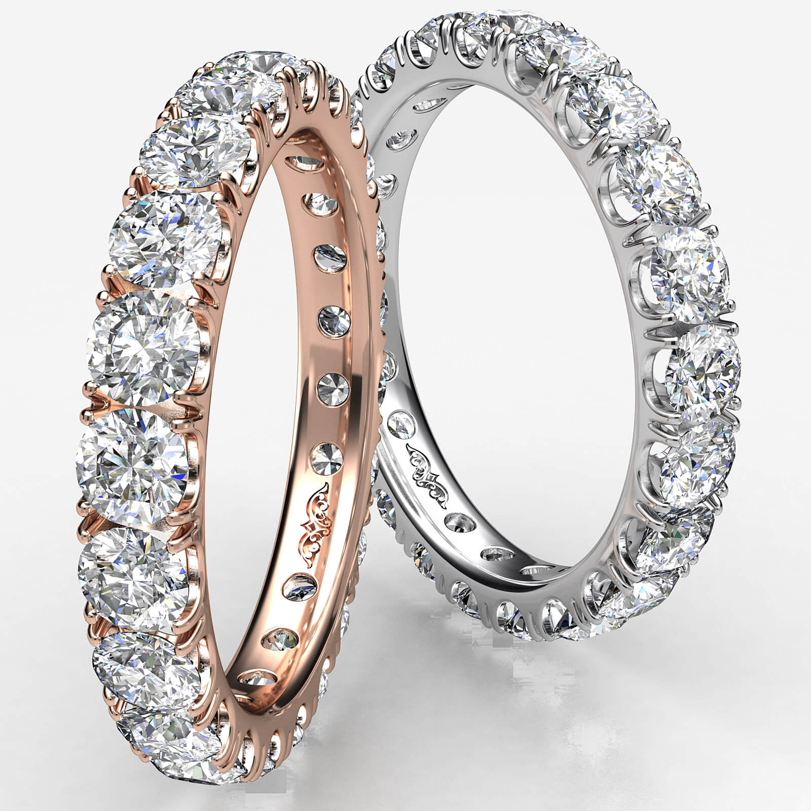 Shop this beautiful french u cut pave round diamond eternity womens wedding band handcrafted in 18k Rose Gold. This wedding ring features round diamonds in a french u cut pave setting. This eternity band is perfect as a wedding ring or anniversary ring, available in 14k & 18k white gold, yellow gold, rose gold and platinum 950. If you don't find your desired jewelry, please don't hesitate to contact our designer to make your custom jewelry design (2.25Ct. tw.)