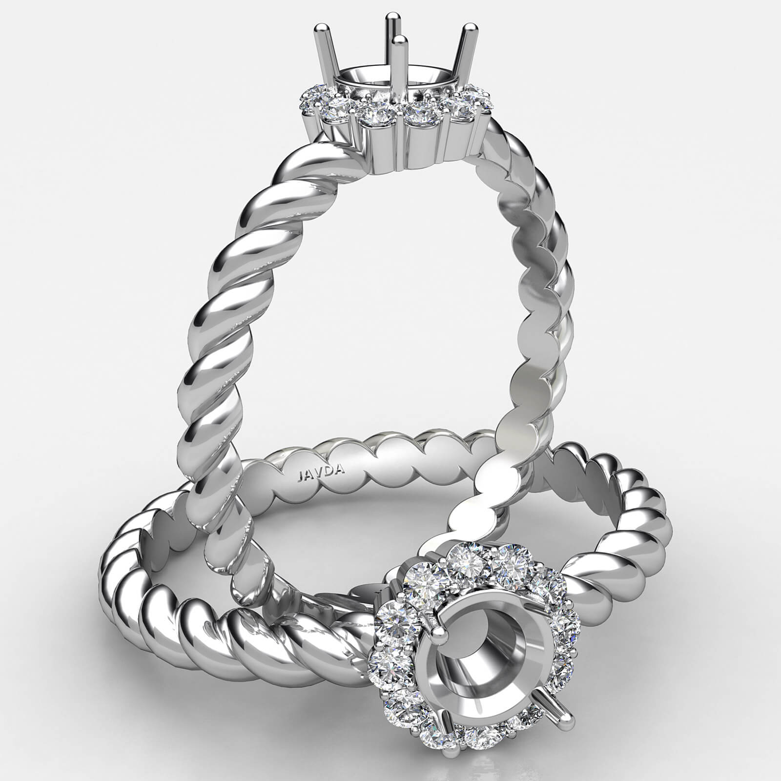 Stunning twisted rope shank round diamond halo semi mount engagement ring made in 18k Gold White. This beautiful ring features round diamonds in a prong setting on halo with the twisted rope detailing on shank. Available in 14k & 18k white gold, yellow gold, rose gold and platinum 950. If you don't find your desired jewelry, please don't hesitate to contact our designer to make your custom jewelry design (0.15Ct. tw.)