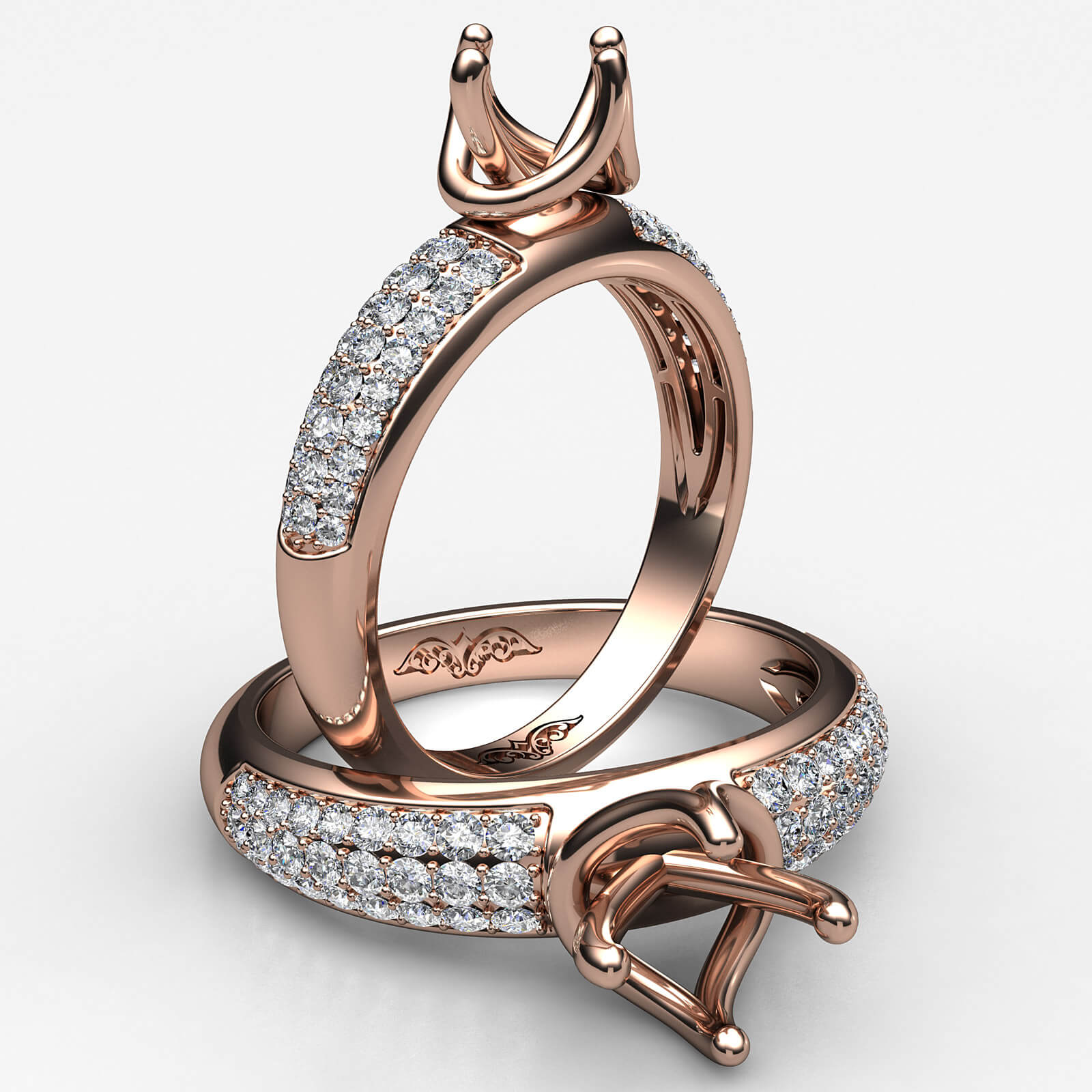 Designer three row round diamond semi mount engagement ring handmade in 18k Rose Gold. This engagement ring setting showcases round diamonds in a micro pave setting on shank. The most romantic gift you can give to your women, available in 14k & 18k white gold, yellow gold, rose gold and platinum 950. If you don't find your desired jewelry, please don't hesitate to contact our designer to make your custom jewelry design (0.3Ct. tw.)