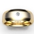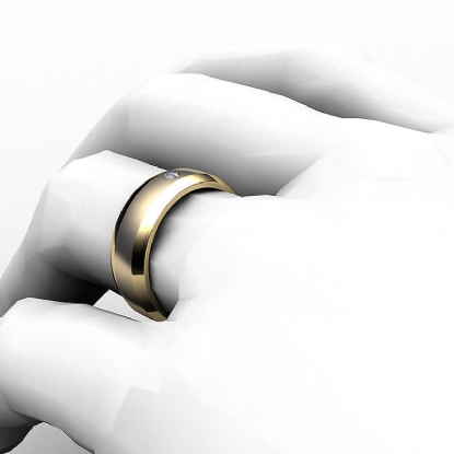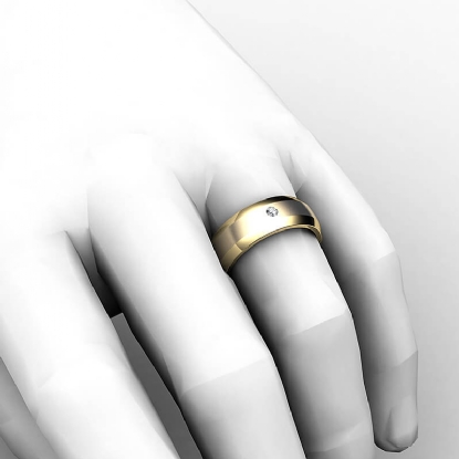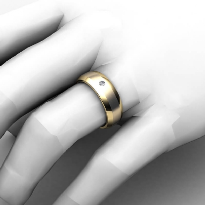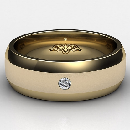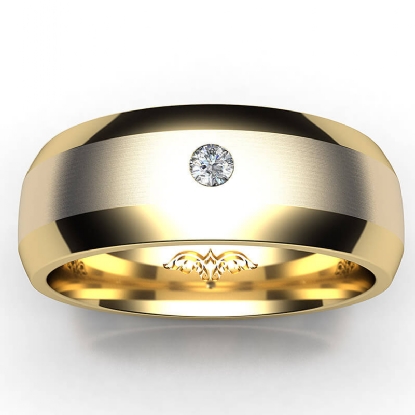 This solid bezel set round diamond beveled edge men's wedding band crafted in 18k Gold Yellow. Features polished beveled edges and center matte finish with single round diamond in bezel setting. Available in 14k & 18k white gold, yellow gold, rose gold and platinum 950. If you don't find your desired jewelry, please don't hesitate to contact our designer to make your custom jewelry design (0.05Ct. tw.)