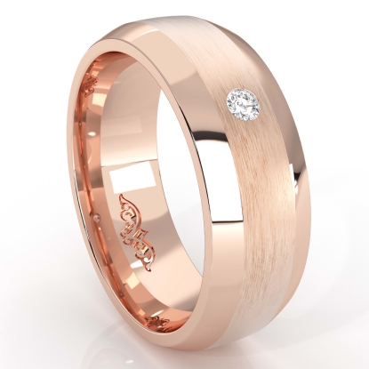 This solid bezel set round diamond beveled edge men's wedding band crafted in 14k Rose Gold. Features polished beveled edges and center matte finish with single round diamond in bezel setting. Available in 14k & 18k white gold, yellow gold, rose gold and platinum 950. If you don't find your desired jewelry, please don't hesitate to contact our designer to make your custom jewelry design (0.05Ct. tw.)