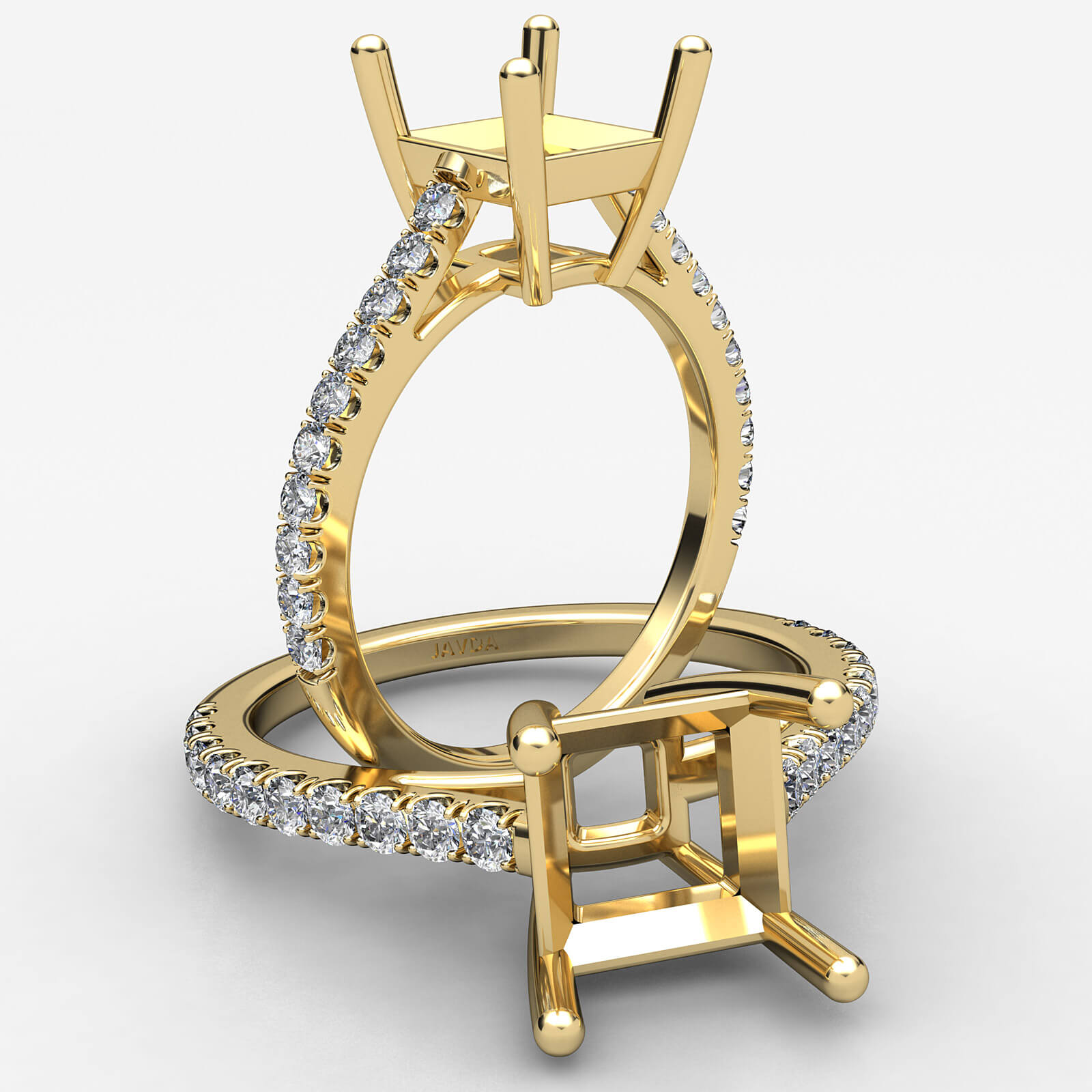 Beautiful cathedral french cut pave princess diamond semi mount engagement ring made in 14k Gold Yellow. This engagement ring setting showcases round diamonds in a french U cut pave set on cathedral shank supporting center diamond with a basket setting. Available in 14k & 18k white gold, yellow gold, rose gold and platinum 950. If you don't find your desired jewelry, please don't hesitate to contact our designer to make your custom jewelry design (0.31Ct. tw.)