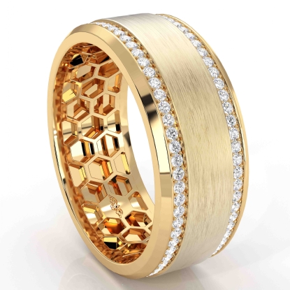 This classic and stylish matte finish beveled edges round diamond eternity men's wedding band crafted in 14k Gold Yellow. Features matte finish center and polished beveled edges with round diamonds in a micropave setting on edges. Also available in 14k & 18k white gold, yellow gold, rose gold and platinum 950. If you don't find your desired jewelry, please don't hesitate to contact our designer to make your custom jewelry design. (0.75Ct. tw.)
