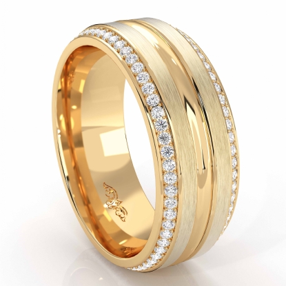 Designer matte & polished finish round diamond men's eternity wedding band made in 14k Gold Yellow. This matte finish ring features center polished dome for a modern look with round diamonds in a micropave setting on edges. Also available in 14k & 18k white gold, yellow gold, rose gold and platinum 950. If you don't find your desired jewelry, please don't hesitate to contact our designer to make your custom jewelry design. (0.4Ct. tw.)