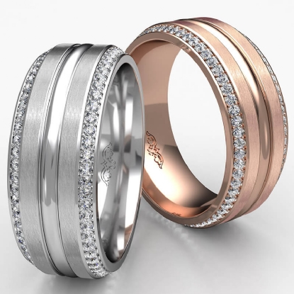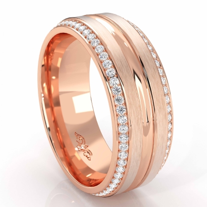 Designer matte & polished finish round diamond men's eternity wedding band made in 18k Rose Gold. This matte finish ring features center polished dome for a modern look with round diamonds in a micropave setting on edges. Also available in 14k & 18k white gold, yellow gold, rose gold and platinum 950. If you don't find your desired jewelry, please don't hesitate to contact our designer to make your custom jewelry design. (0.4Ct. tw.)