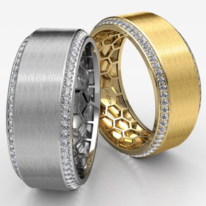 This comfort fit matte finish round diamond eternity men's wedding band handcrafted in 14k Gold Yellow. Features honeycomb filigree inside the ring and center area matte finished with round diamonds in a micropave setting on both sides of the band. Also available in 14k & 18k white gold, yellow gold, rose gold and platinum 950. If you don't find your desired jewelry, please don't hesitate to contact our designer to make your custom jewelry design. (0.75Ct. tw.)