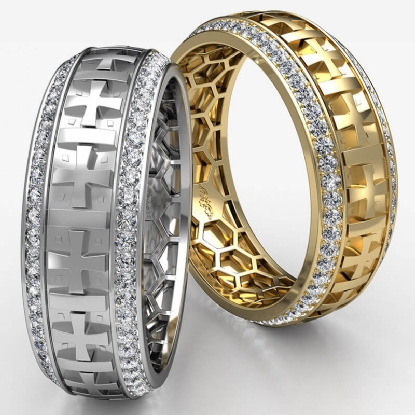 Cross design religious round diamond eternity men's wedding band crafted in 18k Gold Yellow. Features polished finish cross designs along the center with round diamonds in a micropave setting on beveled edges. Also available in 14k & 18k white gold, yellow gold, rose gold and platinum 950. If you don't find your desired jewelry, please don't hesitate to contact our designer to make your custom jewelry design. (1Ct. tw.)
