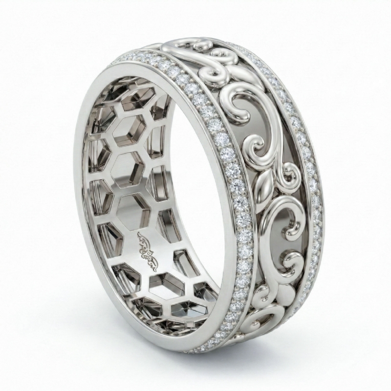 Elegant vintage style designer diamond eternity men's wedding band handcrafted in 18k Gold White. Features vine and leaf pattern hand engraved along the center and round diamonds in a micro pave setting on edges. Also available in 14k & 18k white gold, yellow gold, rose gold, and platinum 950. If you don't find your desired jewelry, please don't hesitate to contact our designer to make your custom jewelry design. (1Ct. tw.)