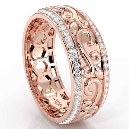 Elegant vintage style designer diamond eternity men's wedding band handcrafted in 18k Rose Gold. Features vine and leaf pattern hand engraved along the center and round diamonds in a micro pave setting on edges. Also available in 14k & 18k white gold, yellow gold, rose gold, and platinum 950. If you don't find your desired jewelry, please don't hesitate to contact our designer to make your custom jewelry design. (1Ct. tw.)