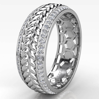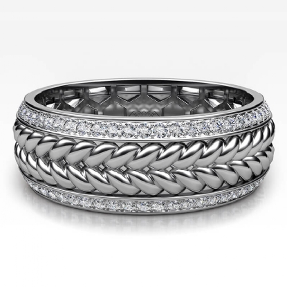 This modern rope style round diamond eternity men's wedding band made in 18k Gold White. Features rope pattern along the center in yellow gold and rose gold with shimmering round diamonds in a micro pave setting on edges. This luxurious ring also available in 14k & 18k white gold, yellow gold, rose gold, and platinum 950. If you don't find your desired jewelry, please don't hesitate to contact our designer to make your custom jewelry design. (1Ct. tw.)