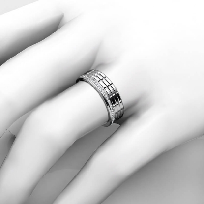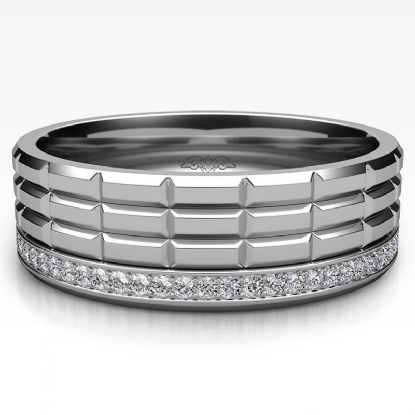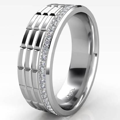 Modern brick pattern grooved round diamond men's eternity wedding band crafted in 18k Gold White. This classic wedding ring features vertical & horizontal grooved with round diamonds in a micro pave setting on one side of the edge. Also available in 14k & 18k white gold, yellow gold, rose gold, and platinum 950. If you don't find your desired jewelry, please don't hesitate to contact our designer to make your custom jewelry design. (0.6Ct. tw.)