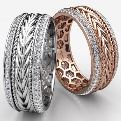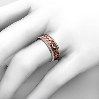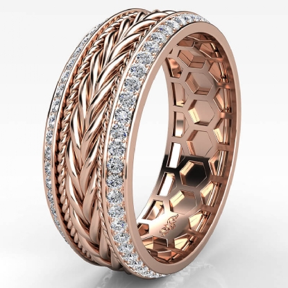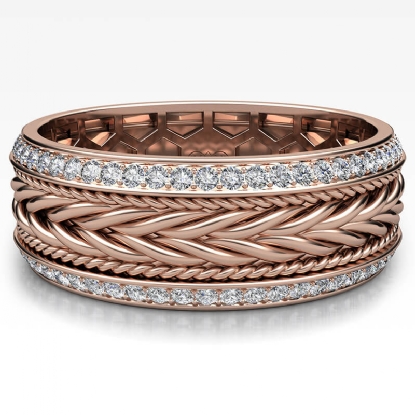 Handmade braided rope pattern round diamond eternity men's wedding band crafted in 14k Rose Gold. This beautiful unique style ring features braided rope along the center in yellow, white, and rose gold with round diamonds in a micro pave setting on beveled edges. Also available in 14k & 18k white gold, yellow gold, rose gold, trio color gold and platinum 950. If you don't find your desired jewelry, please don't hesitate to contact our designer to make your custom jewelry design. (1Ct. tw.)